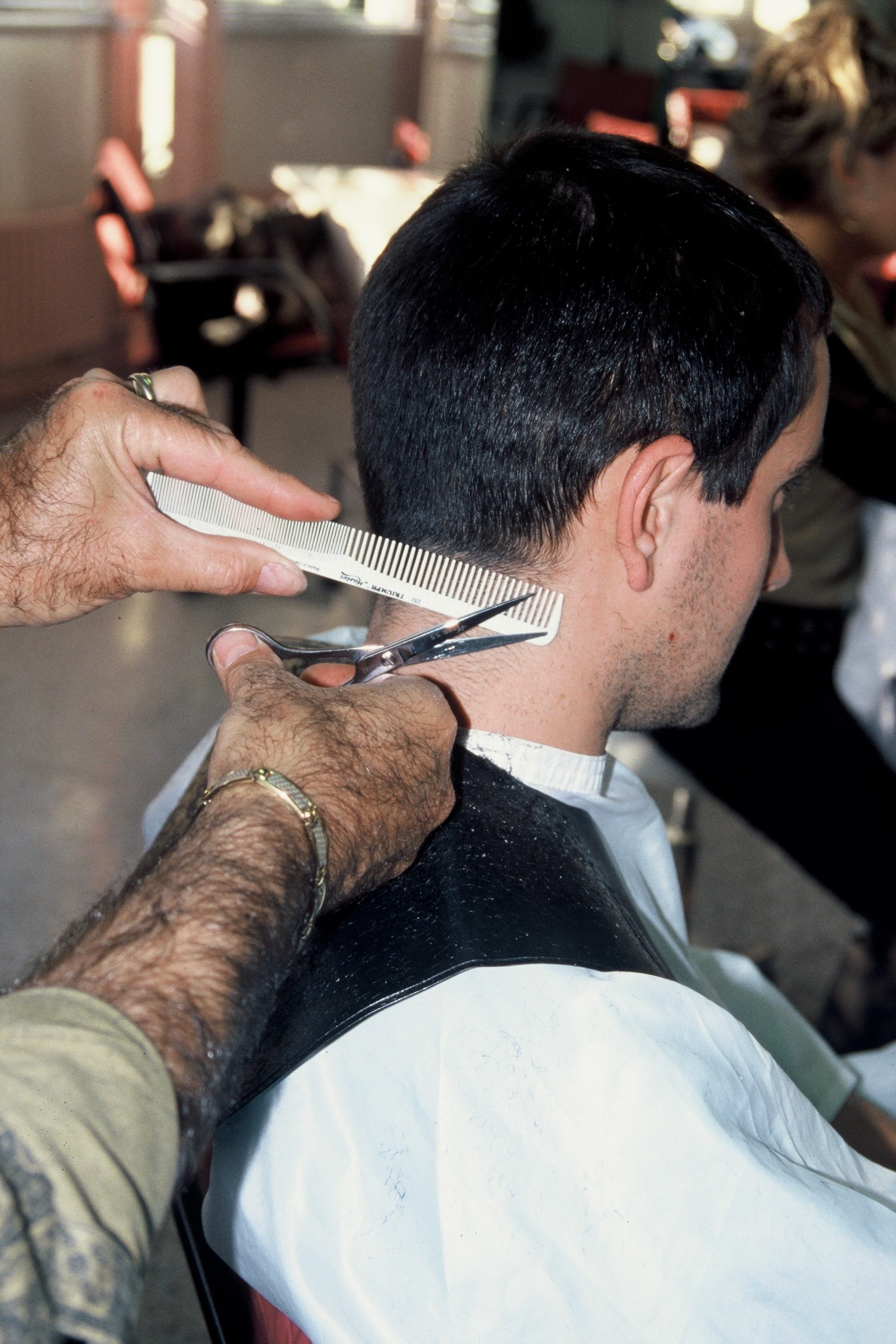 The violence of educational and religious processes is a theme addressed in many of mounir fatmi’s works. It can be found in particular in his sculptures created with calligraphed circular saw blades and his videos and photographs inspired by François Truffaut’s movie « The Whild Child », a scene of which is precisely about scissors and cutting hair. In « Square Cut », the hair salon ritual is associated with the religious ritual of the believer preparing to be in communion with God, and the hairstyle of the customer, the square cut, is representative of a formal rigor whose equivalents can only be found in architecture or in post-minimalistic hairstyling currents.