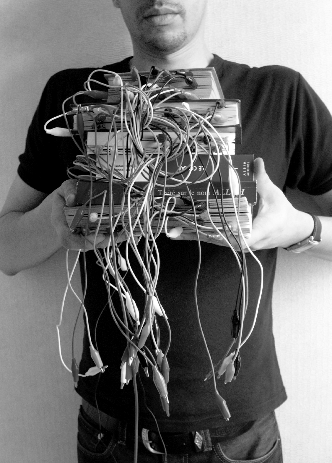 Par analogie avec un réseau électrique, la lecture est une activité intime, intense, énergique et non dénuée de risques. Le porteur de livres mis en scène par Ma Littérature présente d’ailleurs quelques ressemblances avec un personnage médiatique dont l’image est devenue (trop) familière, à savoir le terroriste muni d’une ceinture d’explosifs. Le dispositif de Mounir Fatmi remplace cependant les explosifs par les livres. Au terrorisme religieux ou politique s’appuyant sur la lecture unique, l’ignorance et la violence physique, il oppose une forme de terrorisme artistique, dont les armes sont la connaissance et les liens établis.