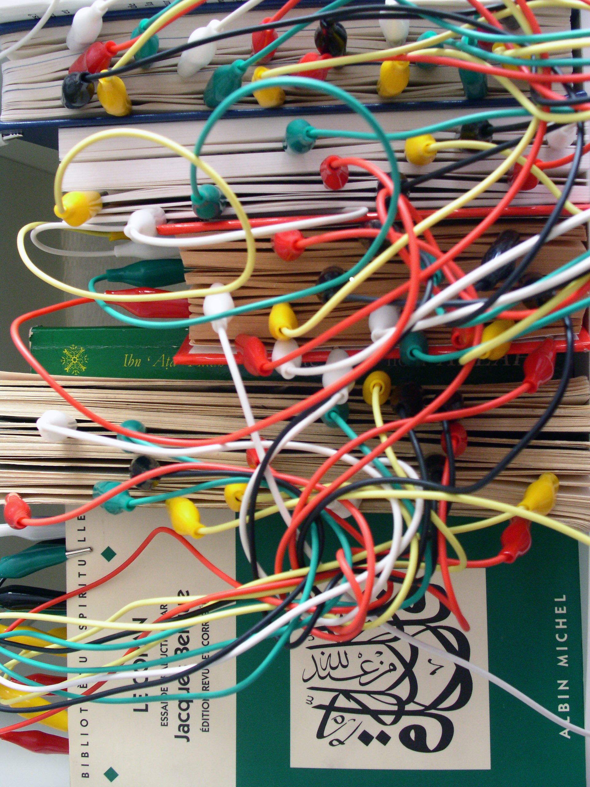 My Literature seeks to multiply the connections one can draw from a book: the profusion of books, electrical wires and colors create a rich and diverse array of possible links. The piece quite literally connects a variety of works to the The Koran, creating an unexpected, and deeply personal, web of relationships. In this way, the Holy Book becomes assimilated into the larger collection of books to which it is attached — it is thus considered by the artist, who has no allegiance to any particular intellectual or religious ideology, to be a literary text. The photographs depict the Koran in relation to other works of literature. This has the effect of “de-sacralizing” its religious nature, thereby opening a space for critical thought. The piece asserts a certain vision of reading, and of intellectual activity in general. At its essence, reading is about drawing connections: a book does not exist in a vacuum, but rather in relationship to other books – the texts adding to, or perhaps contradicting, each other. At the very core of the idea of intertextuality is the discovery (or creation) of links between elements that, on the surface, seem to have nothing in common. Reading is the ultimate expression of personal liberty, and the greatest threat to dogmatic ideologies. When we read, we are free to make the connections that we desire.