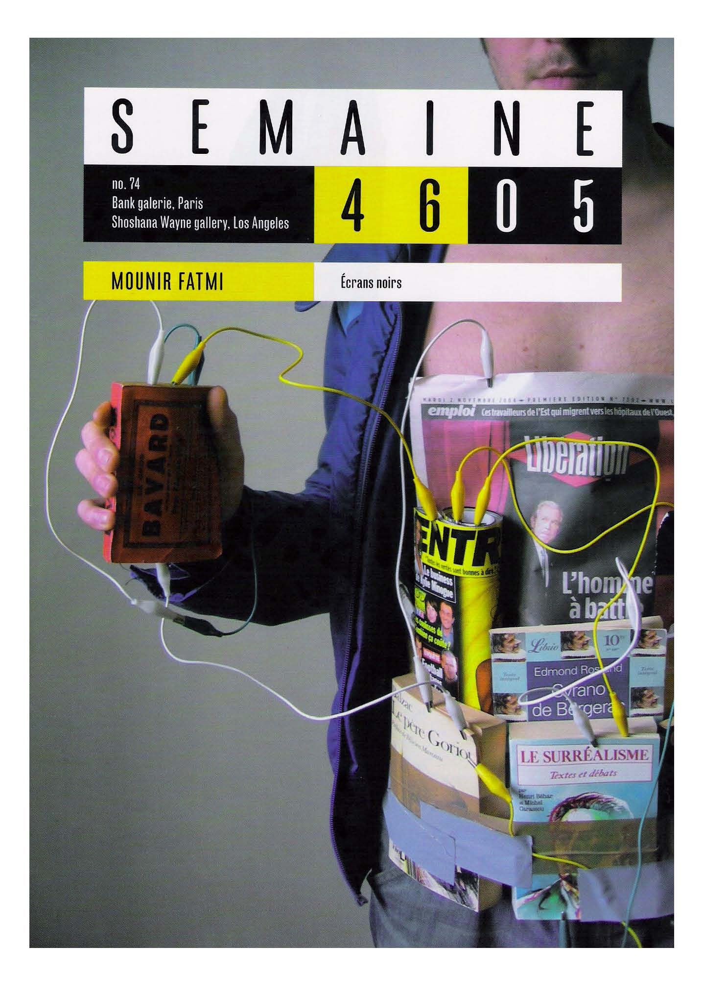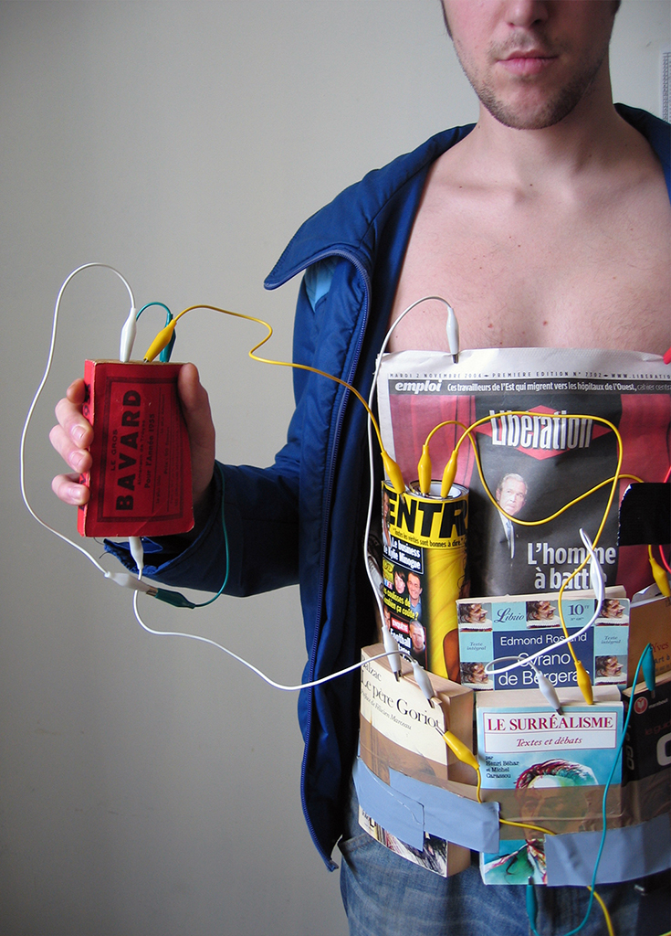 Une collection livresque et aléatoire, constituée en masse compacte, retenue par un ruban adhésif commercial renvoie à son analogie avec une « bombe artisanale »... En ces temps d’insécurité mondialisée, si Mounir Fatmi ne craint pas de jouer de dialectiques sur le fil du rasoir, c’est précisément pour en appeler avec urgence à la sensibilité ravivée des collectivités. Ajoutant à ces explosifs livresques ceinturant la taille de jeune gens, non un détonateur mais un circuit de connections ouvertes à tous les possibles, l’artiste convoque un entier corpus d’utopies intellectuelles et de croyances sociales au sens large pour suggérer en nous un travail mental portant sur les relations informulées d’invisibles réseaux de lectures. Par ce sentiment d’imminence émanant de jeunes ceinturés d’explosifs, ce que vise également l’artiste, c’est une époque médiatique profuse, lourde d’un potentiel symbolique toujours réversible.