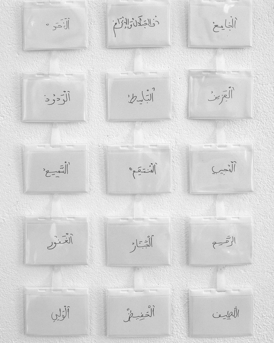 L’art musulman n'a produit aucune image de Dieu, la religion interdisant sa représentation. Il est évoqué dans le Coran par 99 noms tels le Superbe, le Créateur, le Formateur ou le Tout et Très Contraignant. Dans cette proposition, le public se trouve confronté à ces noms écrits sur des badges de conférence. Ainsi c'est malgré tout à travers une image que chaque spectateur s'imagine intérieurement Dieu. La richesse par rapport à l'image qui aurait pu être montrée ne fait pas de doute.
