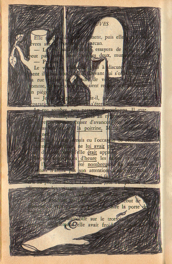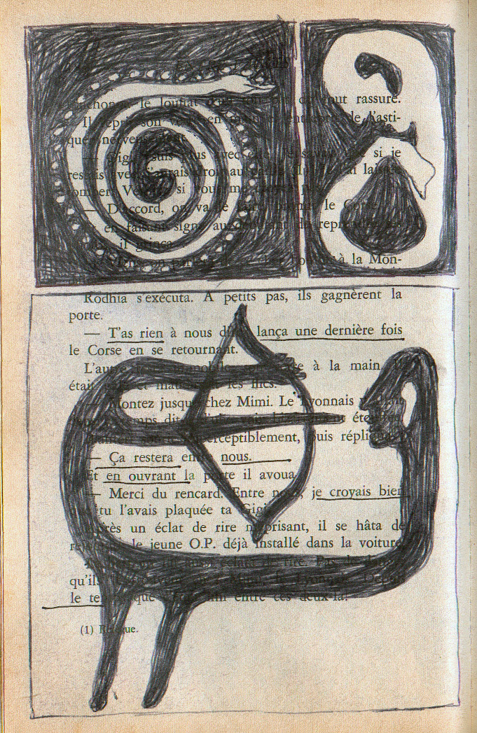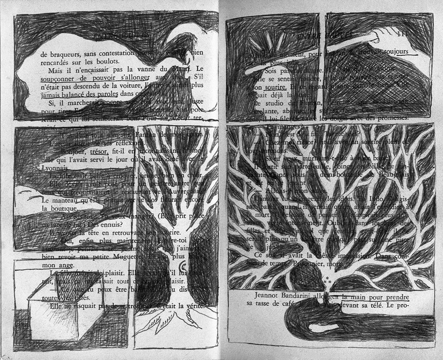 1995-1996, drawings with pencil on a roman noir Entre fauves by Jacques Risser,