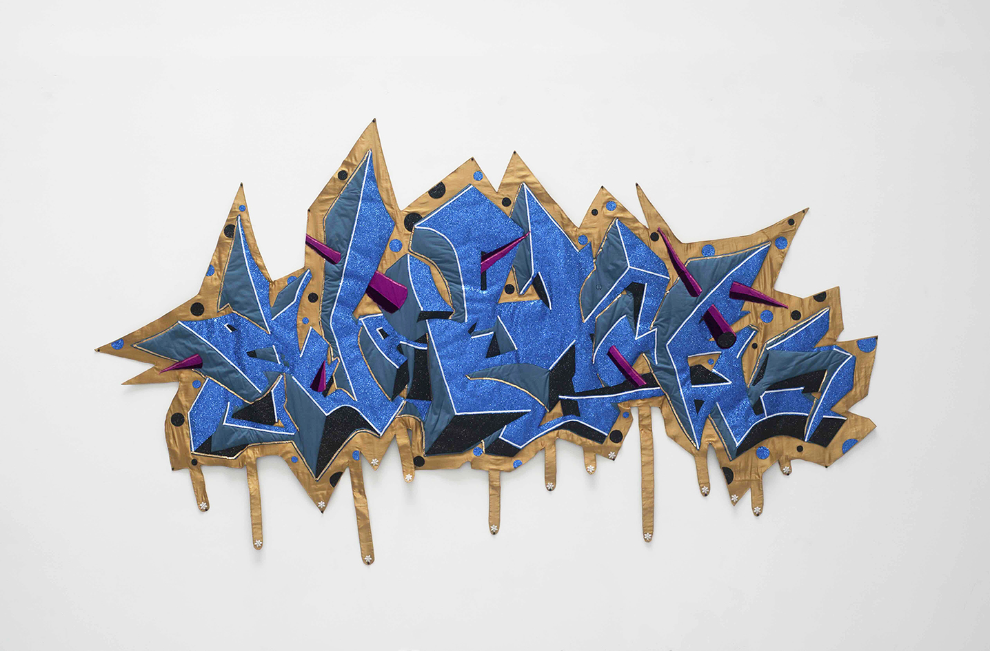 Dans cette œuvre se trouve aussi une question sur le genre. La culture du graffiti a toujours été très masculine, pour ne pas dire macho, un environnement dominé par de jeunes hommes marquant leur territoire, affirmant une forme de domination sur la culture clandestine. Cela se faisait vite, généralement de nuit, pour que les artistes ne soient pas vus. Graffiti Divin possède la force et l’impact d’un tag de rue, et de loin il a l’air d’avoir été peint, mais lorsqu’on s’approche, on s’aperçoit que l’œuvre a été cousue pièce par pièce, un procédé laborieux et traditionnellement plutôt associé à un travail féminin.