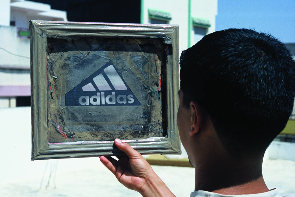 Les sérigraphies proposées par mounir fatmi pourraient se concevoir comme une réponse à cette attaque de l'aura artistique par le système marchand. Elles mettent en scène du logo de la marque : le titre invite éventuellement à une relecture, à un examen des origines historiques du logo et de la marque. Ce qui conduit parfois à des (re)découvertes curieuses. En ce qui concerne Adidas par exemple : un modeste savetier allemand à l'origine, des chaussures fabriquées main, des liens avec le régime nazi pendant la seconde guerre mondiale, presque complètement oubliés de nos jours. La stratégie artistique mime la stratégie commerciale en suivant cyniquement la logique jusqu'au bout : tant qu'on y est, pourquoi ne pas appliquer directement les logos des marques sur les œuvres d'art - et pourquoi pas le nom d'une marque de vêtement, de cosmétique ou de voiture sur le portrait de la Joconde que des millions de visiteurs contemplent chaque année ? L'opération artistique ironise pour finir. Elle inverse le processus commercial et dénonce le manque d'imagination des grandes marques. A l'instar de la marque, l'artiste s'empare du logo sans vergogne et ainsi s'approprie son pouvoir de captation de l'attention du public.