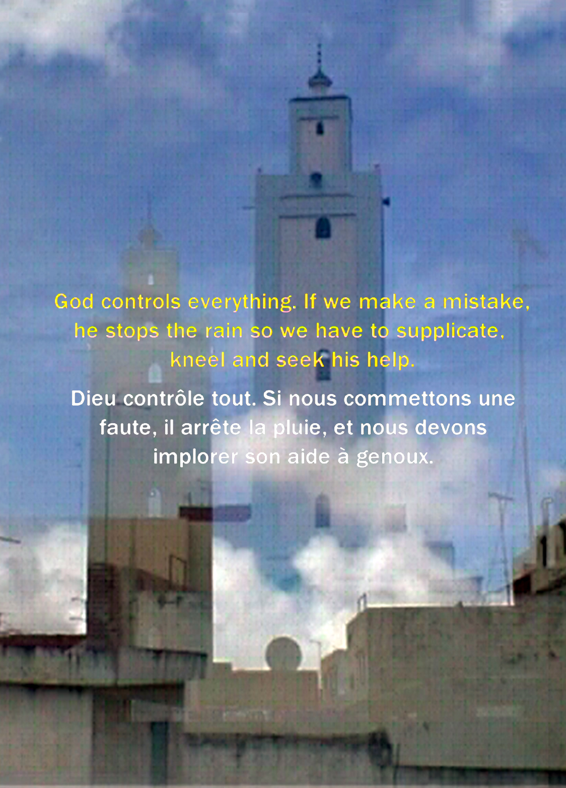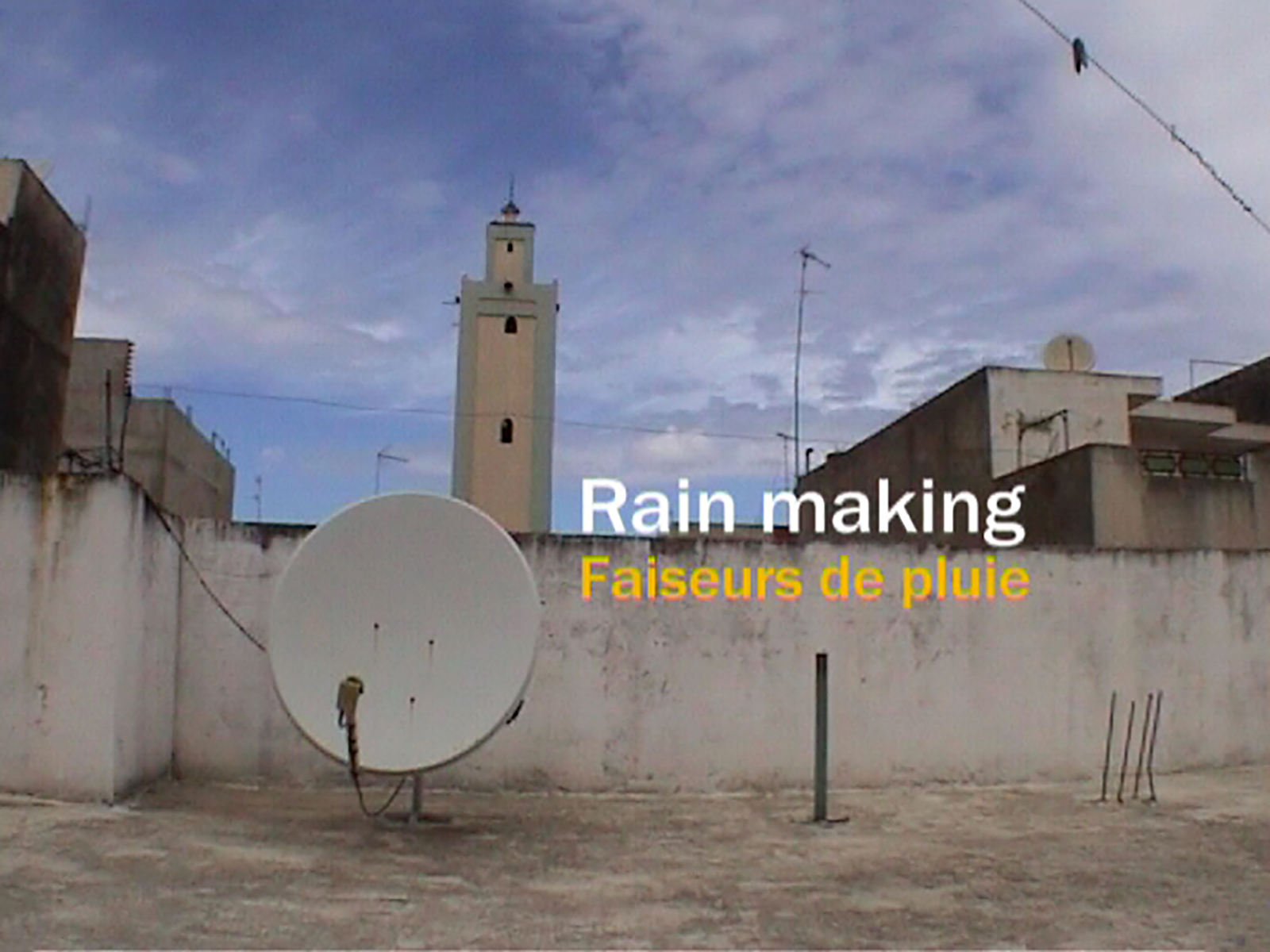 Against a background of chants and prayers, the image of a minaret, emerging from amongst satellite-clad roof terraces, is repeated in a swift staccato montage. Accelerated clouds cross the sky behind it, and gradually envelop and overlap the sacred building. Pre-Islamic Arabs thought that rainfall came from the movement of stars.