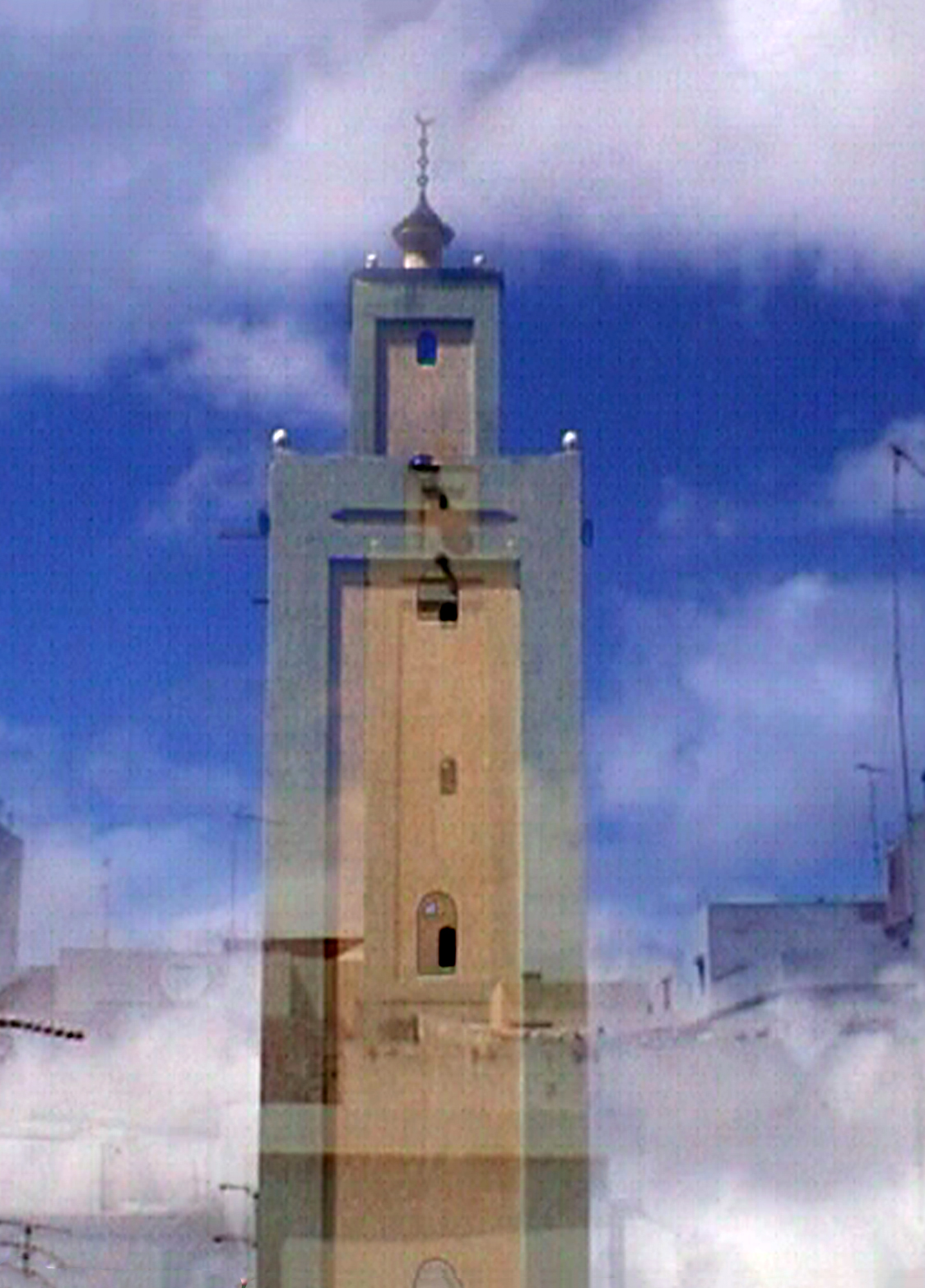 Sur fond de chant et de prière, l’image d’un même minaret, émergeant parmi des toits terrasses équipées de paraboles, se répète dans un montage saccadé et rapide. Derrière lui des nuages passent en accéléré, et d’autres, peu à peu, enveloppent en surimpression le bâtiment sacré.