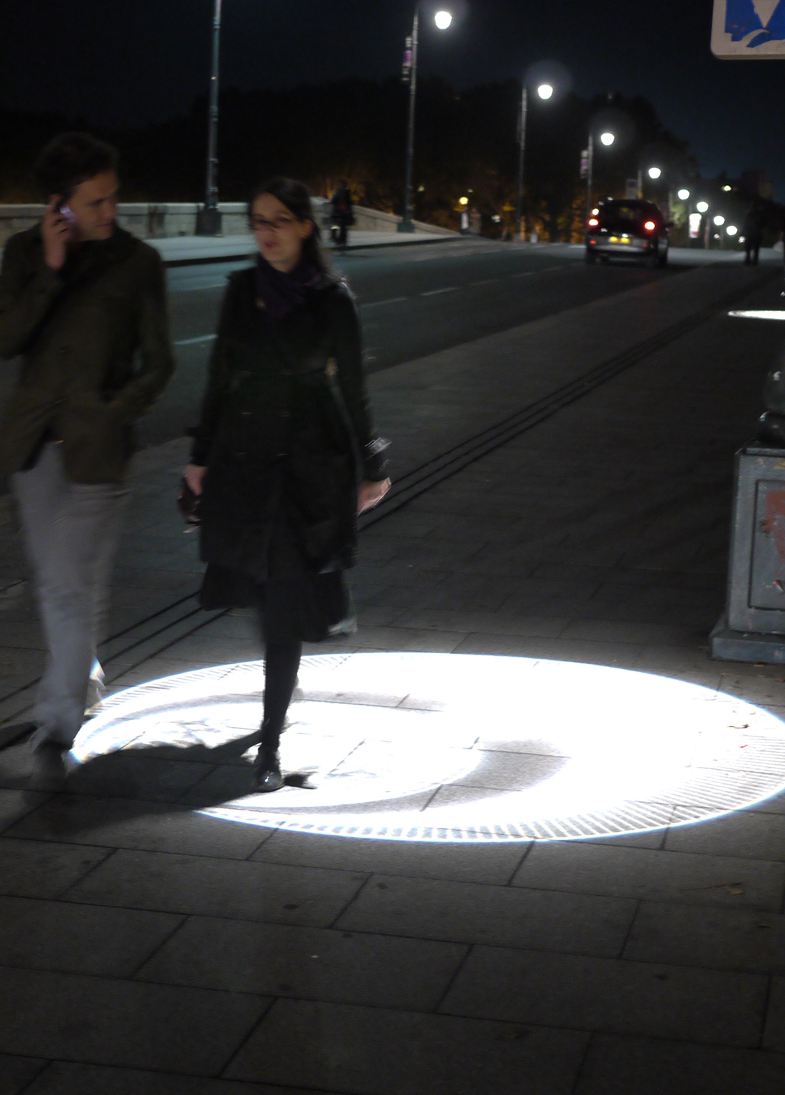 Technologia is a luminous installation comprising 25 fixed or kinetic images that are projected with a quick and jerky rhythm on the surfaces of architectural buildings in big cities across the world, from Geneva to Doha and Toulouse. These circular images combine geometric shapes with motifs taken from Arabic and religious calligraphy.