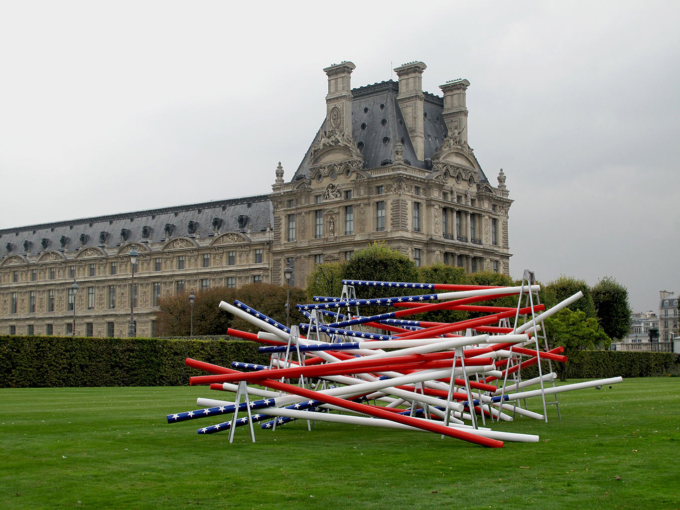 A l’aide de barres de saut hippique, repeintes aux couleurs de la bannière étoilée, mounir fatmi transforme le drapeau américain en un immense obstacle impossible à franchir. Cet amas complexe de barres rouges, blanches et bleu, tel un mikado géant, occupe l’espace du patio et se dresse comme une sculpture à la fois imposante, instable et dangereuse.