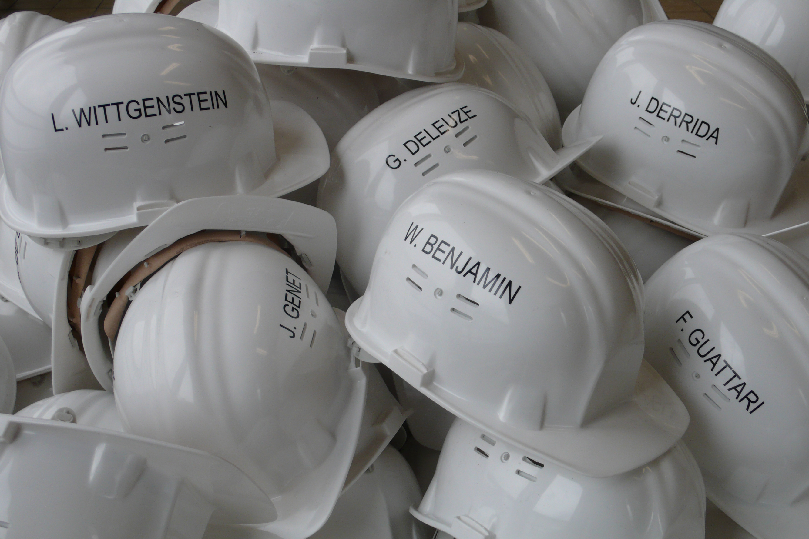 Their names inscribed on building site hard hats immediately suggest the notion of construction and at first sight provide a formal means to create a link with architecture, which goes beyond the notion of constructing a frame, creating a shift towards a way of formulating thought, its history and its connections. If thought is both a construction and construction material, systems of thought are built up into architecture, a different sort of architecture. The parallel between workman’s work and a piece of work that is constituted by the structuring of an idea, a theory or a political system is evident here.