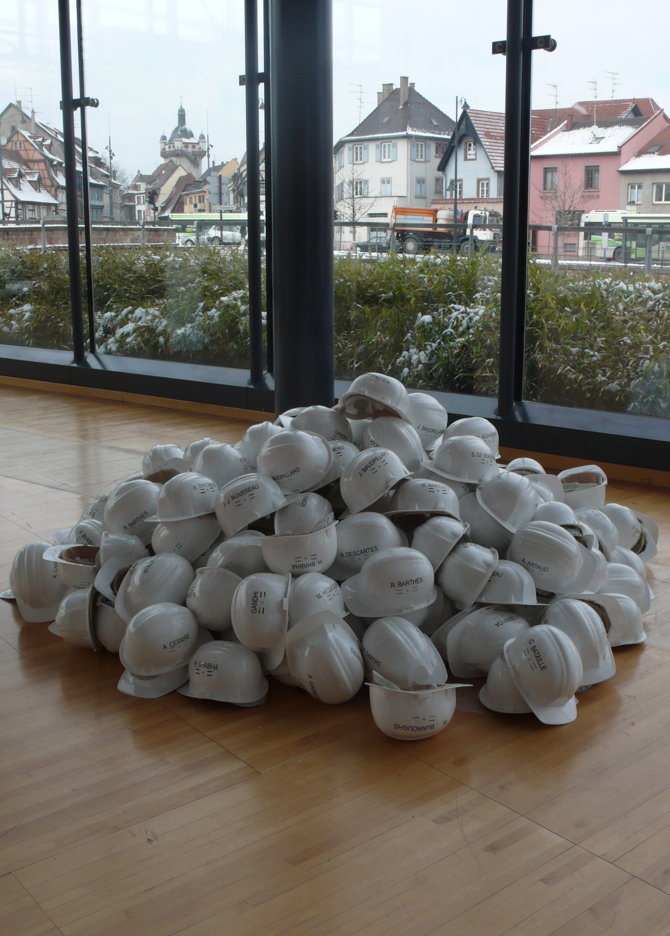 So the hard hats marked with the names of thinkers, abandoned in growing piles, as if the site had been deserted, seem to demonstrate the urgency of getting back to work, to oppose one single thought, in a humanist way, if that's still possible in the reign of cynicism and consumer goods.