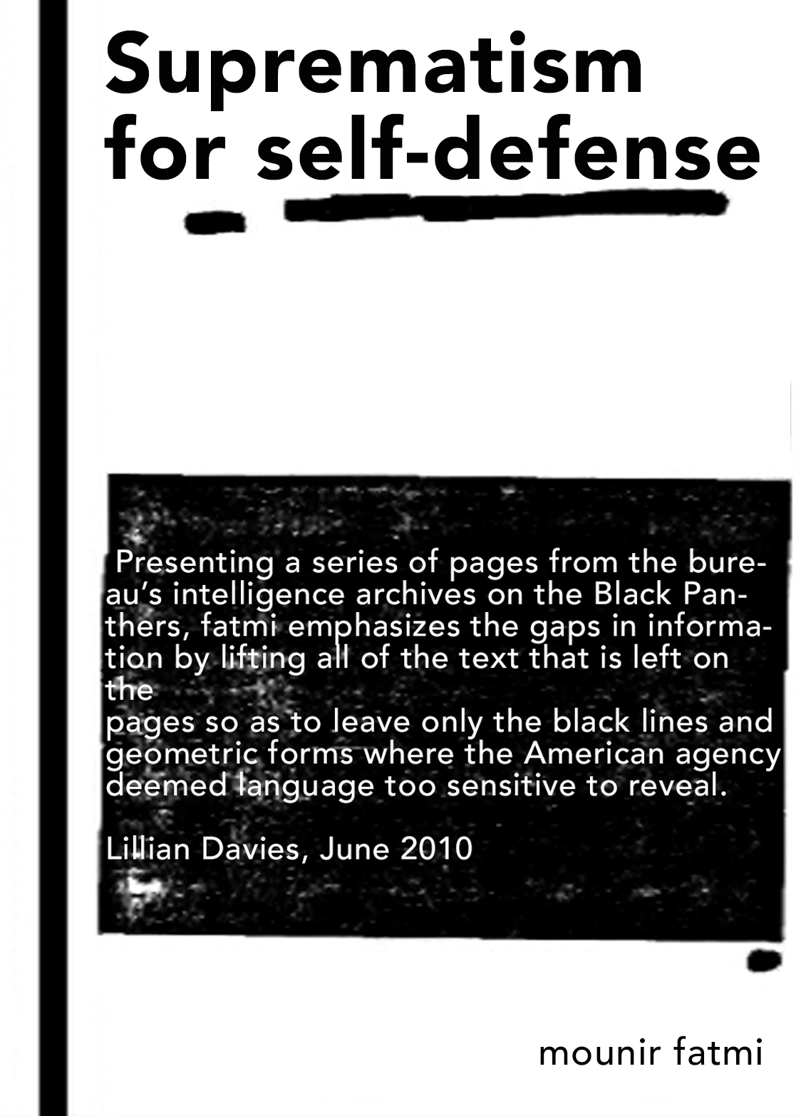 In 2006, Mounir Fatmi began the project “Suprematism for Self-defense”, with the FBI archives on the Black Panther Party as a starting point, as they were made public by the American government under the Freedom of Information Act.