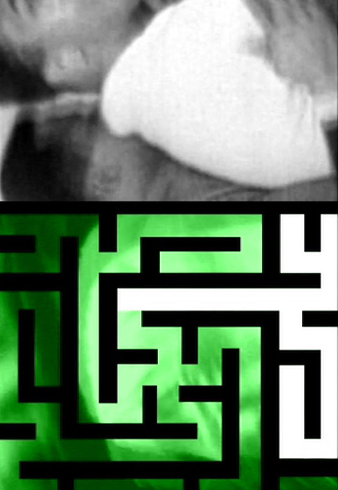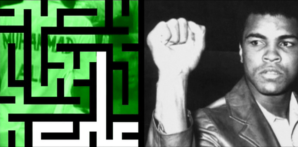 Muhammad Ali, the Labyrinth is a video showing images of the famous boxer at various ages, from his youth and his early boxing days to adulthood, after he had retired from his career as an athlete. It shows Muhammad Ali training and fighting in the ring, dodging punches or returning them, one after the other. It mixes images from his victories, his opponents knocked out on the floor, and of his defeats, when he was the one lying on the floor. The soundtrack plays Muhammad Ali’s voice, recorded during his many declarations to the press and to the public, most of the time right before a match. The images are accompanied with graphic transcriptions of his most famous declarations, some of which went down in history. The filmed scenes are shown through the green prism of a graphic labyrinth created by the artist, whose structure is made up of the repetition of one single complex geometric element formed by two words written in Kufic Arab calligraphy: the name of the prophet Muhammad and the first name of the man who stood by his side during his entire ministry, Ali. The artwork questions, through the figure of Muhammad Ali, the status of the hero and the anti-hero in popular culture from the 1960s to the present day. It explores the relation between the personal trajectory of a great black American athlete and the history of segregation in the USA, as well as the origins and consequences of his conversion to Islam.