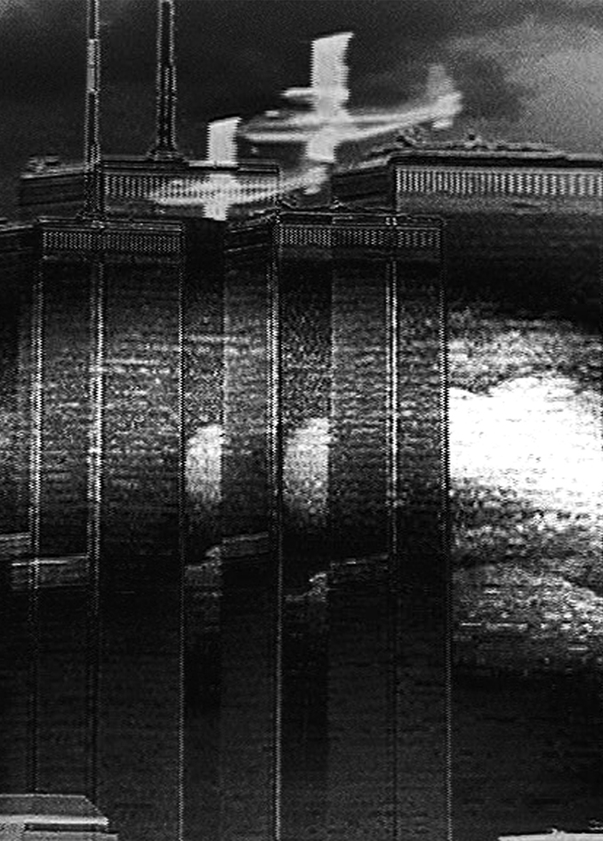 The prints show architectural elements that are easily identifiable. They trigger an almost immediate response of recognition of the landscape by the viewer and a feeling of familiarity. The images thus highlight the fact that New York imposes itself in our collective imagination as a cultural reference. Yet they also provoke anxiety and a feeling of strangeness when faced with a landscape that has been modified and recomposed, challenging our visual recognition. They also revive the memory and the fear of a terrorist attack. In this way, they convey the threat that these images of the city could be transformed into archive images belonging to a distant past.