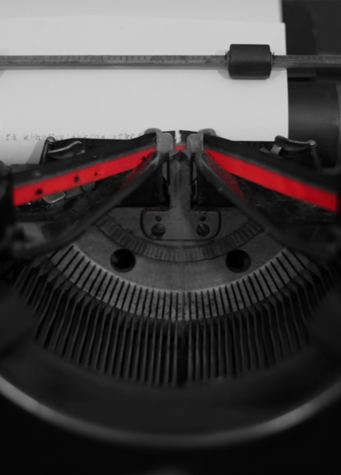 mounir famti’s photographic series entitled History is not Mine resumes the narration of his eponymous video. These images, in which a ribbon of blood red is the only color present, depict a man whose face remains concealed as he strikes the keyboard of a typewriter with hammers. This series of photographs, just like the video, can be seen as a direct response to Printemps de Septembre de Toulouse (2012) (Toulouse’s Spring of September) which bore the title L’Histoire est à moi (History is mine). On this occasion, Technologia, mounir fatmi’s installation that combined circular Koranic verses with elements inspired by Marcel Duchamp’s Rotoreliefs, had been withdrawn by the organization following incidents provoked by the public. Similarly, the Sleep Al Naïm video, a tribute to Salman Rushdie, was censored at the Arab World Institute in Paris. These events left a mark on the visual artist and engendered an awareness as well as a “disappointment.”