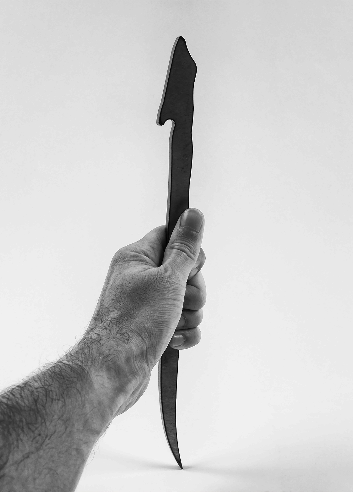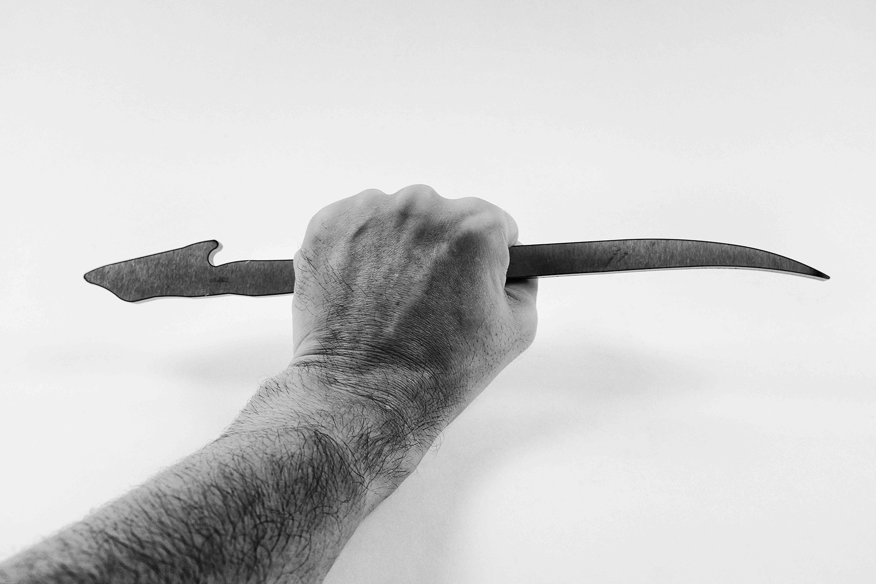 Alif is a black and white photographic piece that shows a man’s forearm, grasping a slightly curved and elongated shape in his hand like a dagger. This series of photographs began in 2015 and is a work in progress that is to be developed on a set of photographs, videos, and installations.