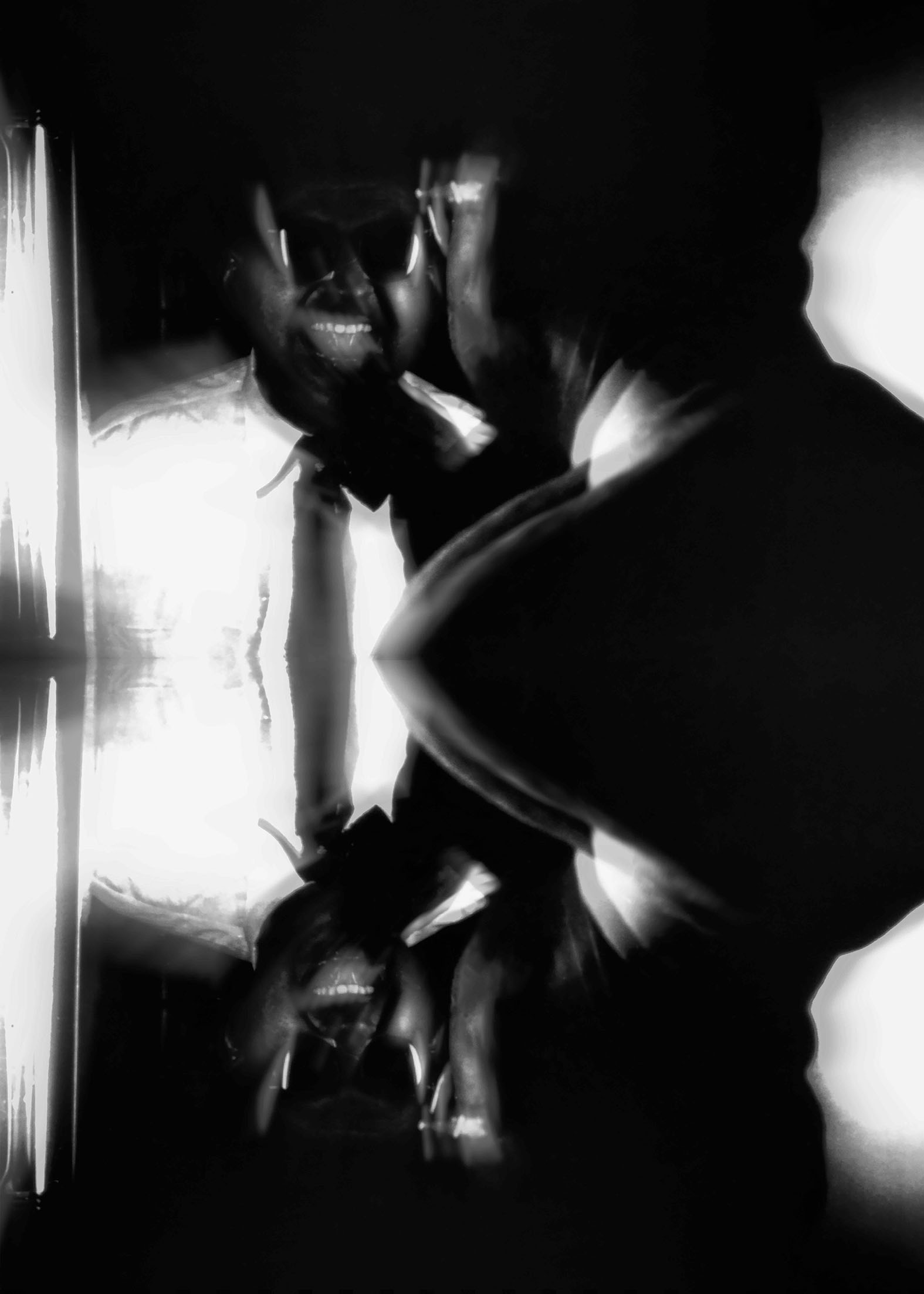 “Mirror” is a manipulated black and white photograph that shows Griffin looking at himself in the mirror at this moment of transformation, when he discovers himself for the first time with a black face. Here fatmi has gone in and created a sort of repetition of the mirror’s reflection from above and below. The results create a darker, blurrier image in which Griffin’s body seems to vibrate in this moment of change.