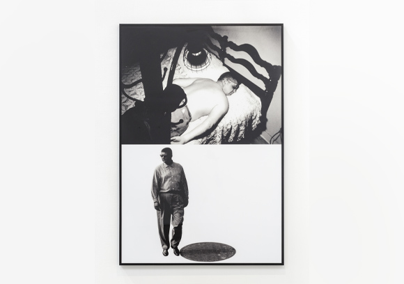 Dans le diptyque « Sous la peau », l’image du haut montre Griffin en intérieur, couché à plat ventre sur un lit, une lampe à UV suspendue au-dessus de lui comme une lumière d’interrogatoire. Les ombres de la lampe sont d’un noir foncé et semblent se refermer sur lui. L’image dégage une atmosphère menaçante, claustrophobe, et il est difficile de déceler ce qui s’y passe au juste. L’image du bas le montre à l’extérieur, marchant dans la rue, son visage désormais noir. Dans cette photo, Fatmi a effacé tout ce qui entoure Griffin : voitures, passants, magasins, le laissant marcher seul dans un espace vide et blanc, comme s’il marchait dans la lumière ou, sans doute est-ce une meilleure analogie, avec un spot de lumière blanche au-dessus de lui, l’isolant de la vue du public. Il est à découvert et vulnérable, comme s’il marchait seul en terre inconnue. Le seul élément qui contraste avec le blanc est une bouche d’égout circulaire et noire, juste à côté de son pied, comme s’il s’agissait d’un piège caché dans lequel il pourrait facilement tomber. Ces deux images reflètent la dualité à laquelle Griffin s’est soumis. Elles représentent les contrastes entre l’intérieur et l’extérieur, l’obscurité et la lumière, le privé et le public, mais aussi entre la sécurité personnelle et l’objectivation, des contrastes que Griffin lui-même explorait de par ses actes.