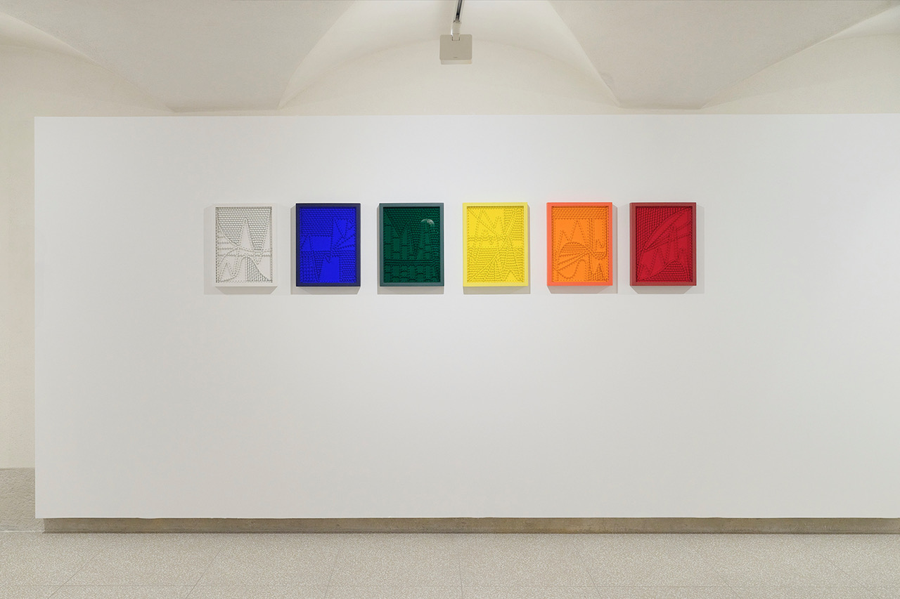 The Limits to Growth is a series of sculptures that explores the relationship between economic growth, sustainability, and the inevitable tension between progress and limits. These works are composed of white coaxial cables intertwined on wooden panels and covered with colored plexiglass, which add depth and dynamism to the pieces.