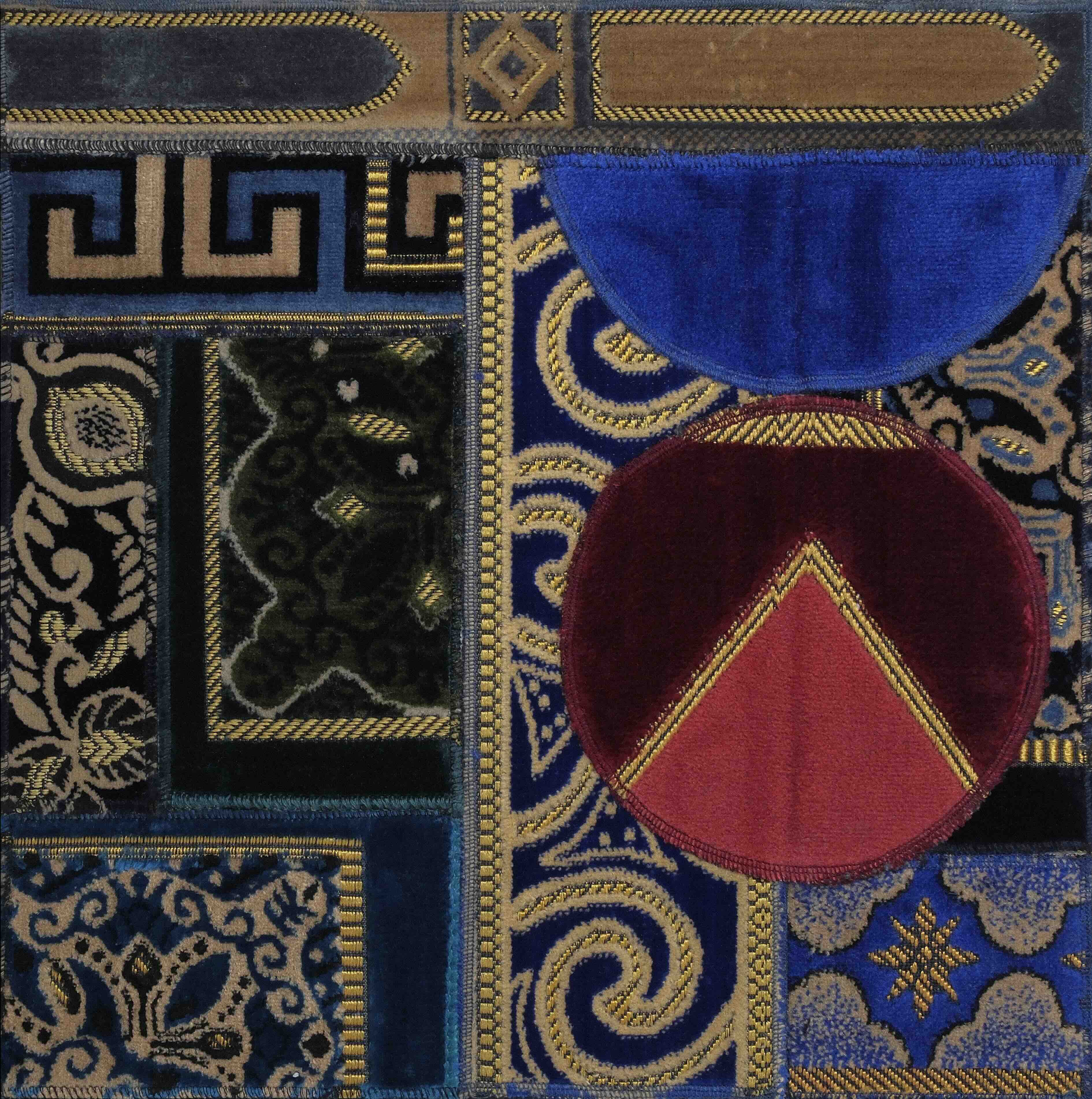 The largest in this series is the triptych titled, Labyrinth N° 5, 2012. Made with fragments of deep midnight blue, gold, and silver embroidered carpets, Labyrinth N°5 calls to mind a deconstructed Baroque church or Byzantine mosque. Repeating geometric patterns of small circles bordered by thick lines are placed vertically and horizontally, the dots moving up and down like some mesmerizing video game. There are layers of cutouts that are more ornamental with floral or lace-like patterns, as well as architectural and frame motifs. The eye moves up and down, right and left, seeking an escape, but there seems to be none, there is no open space, no end. Like the patterns of actual labyrinths, the work is at once rhythmic and claustrophobic.