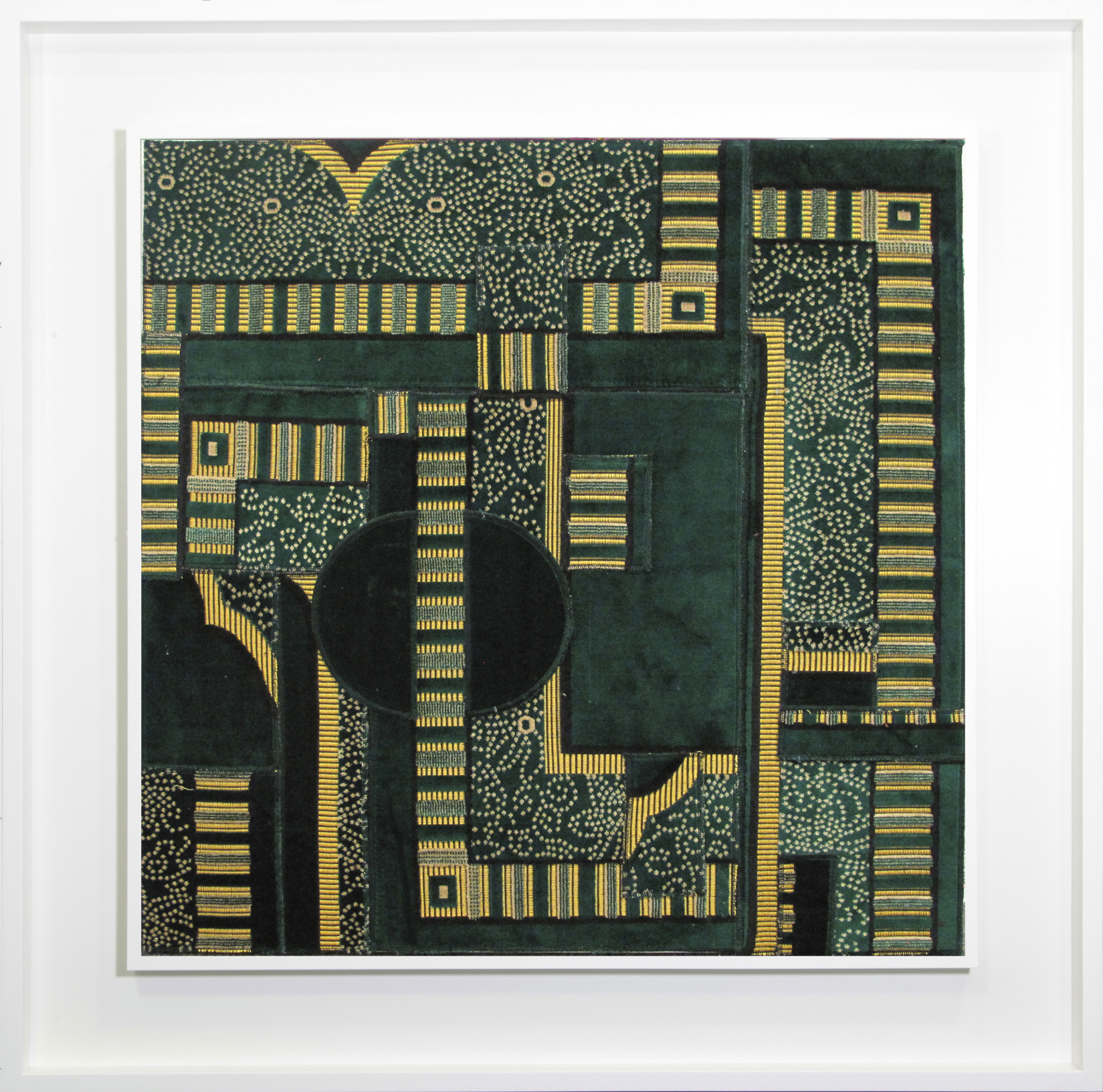 La plus grande pièce de cette série est un triptyque intitulé Labyrinthe N°5 (2012). Fait de fragments de tapis bleu nuit, dorés et argentés, Labyrinthe N°5 fait penser à une église baroque déstructurée ou à une mosquée byzantine. Des motifs géométriques répétitifs de petits cercles enserrés dans des lignes épaisses sont placés verticalement et horizontalement, donnant l’impression que les points montent et descendent comme dans un jeu vidéo hypnotique. Il y a des couches de découpages plus ornementaux, avec des motifs floraux ou semblables à de la dentelle, tout comme des motifs architecturaux et évoquant des cadres. Le regard monte, descend, va de gauche à droite, cherchant une issue, mais il semble n’y en avoir aucune ; il n’y a ni espace vide, ni fin. Comme les motifs d’un vrai labyrinthe, cette œuvre est à la fois rythmique et claustrophobe.