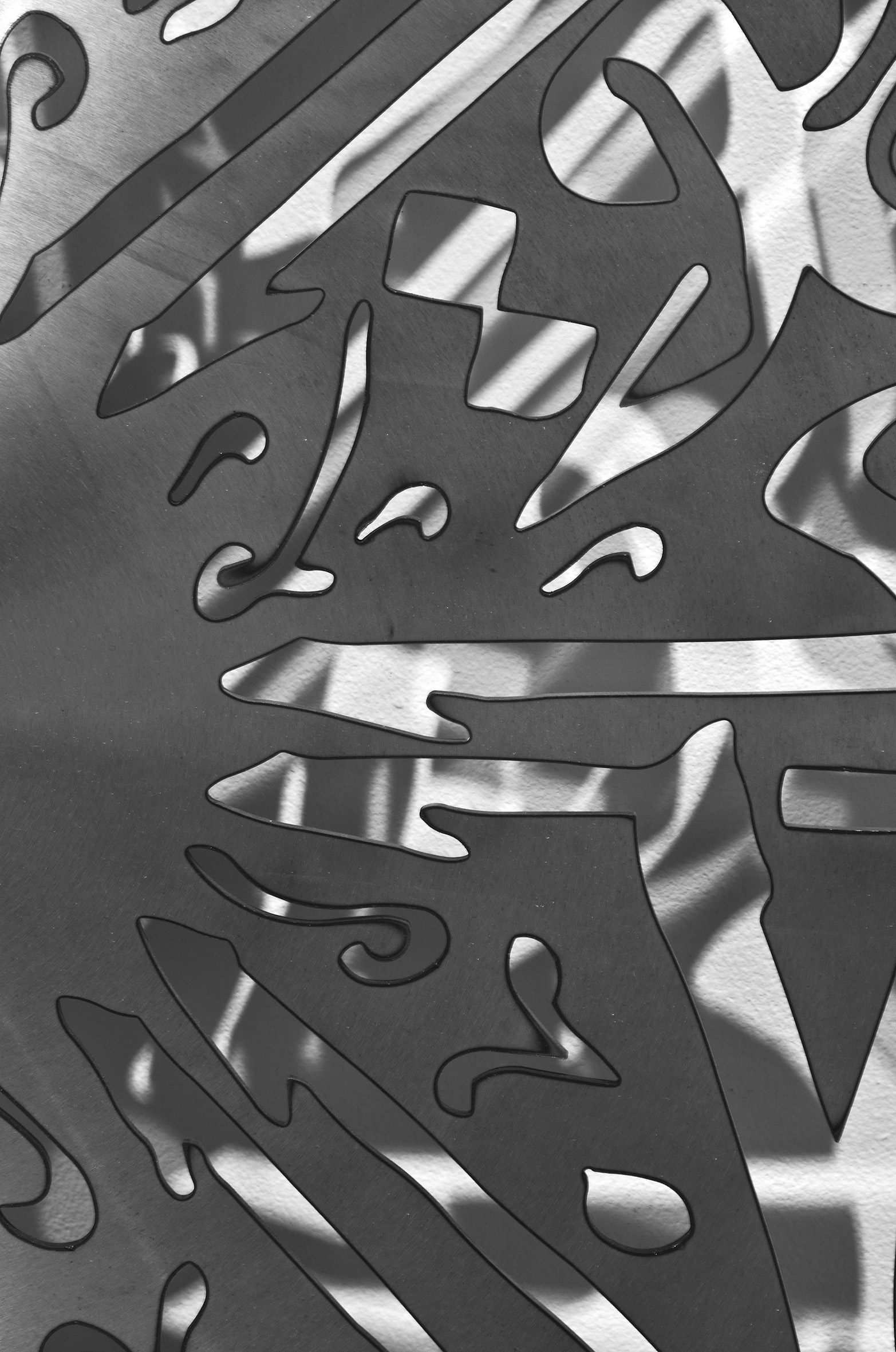 A circular saw blade of impressive dimensions with large sharp teeth, Between the Lines is decorated on its surface with calligraphic motifs of classical Arabic writing, cut with precision out of polished steel with gleaming reflections. The stylized writing refers to surah 112 of the Koran, entitled "Al-Ilkhlas" (“The Purification”), which affirms the transcendence of God (Al-Tawhid) and evokes the testimony of the believer: “Say: ‘He, Allah, the only one / Allah the luminous / He bears no child and is not born / He has no equal!’”