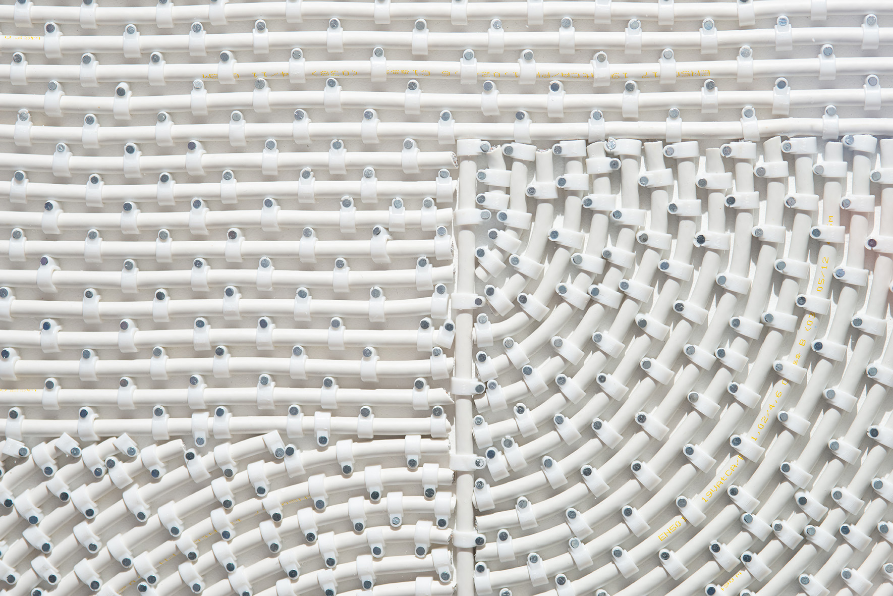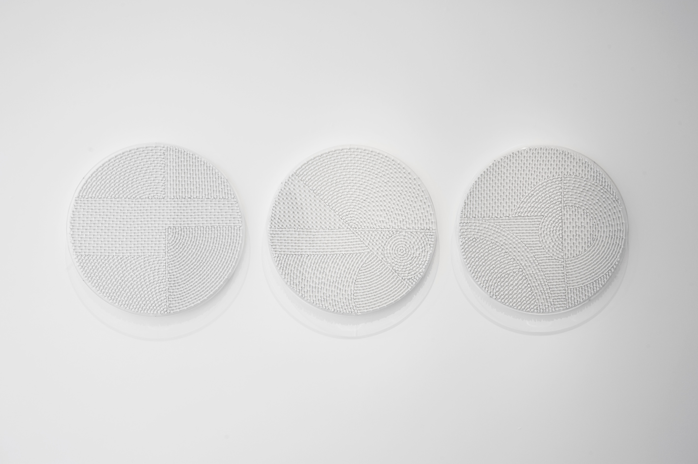 Circles, with their immaculately pure whiteness, their associations with various shapes, the tensions between lines and curves and the revelation and occultation of figures, attract the viewer’s gaze as much as they raise questions. The Circles series is made using white antenna cables – a frequent material in Mounir Fatmi’s work since 1998 – arranged in geometric motifs and attached to circular white boards with rounded tacks. The compositions obtained in this way are sometimes superimposed with another white round panel made of Plexiglas, cut out in certain places, letting the coaxial cables appear.