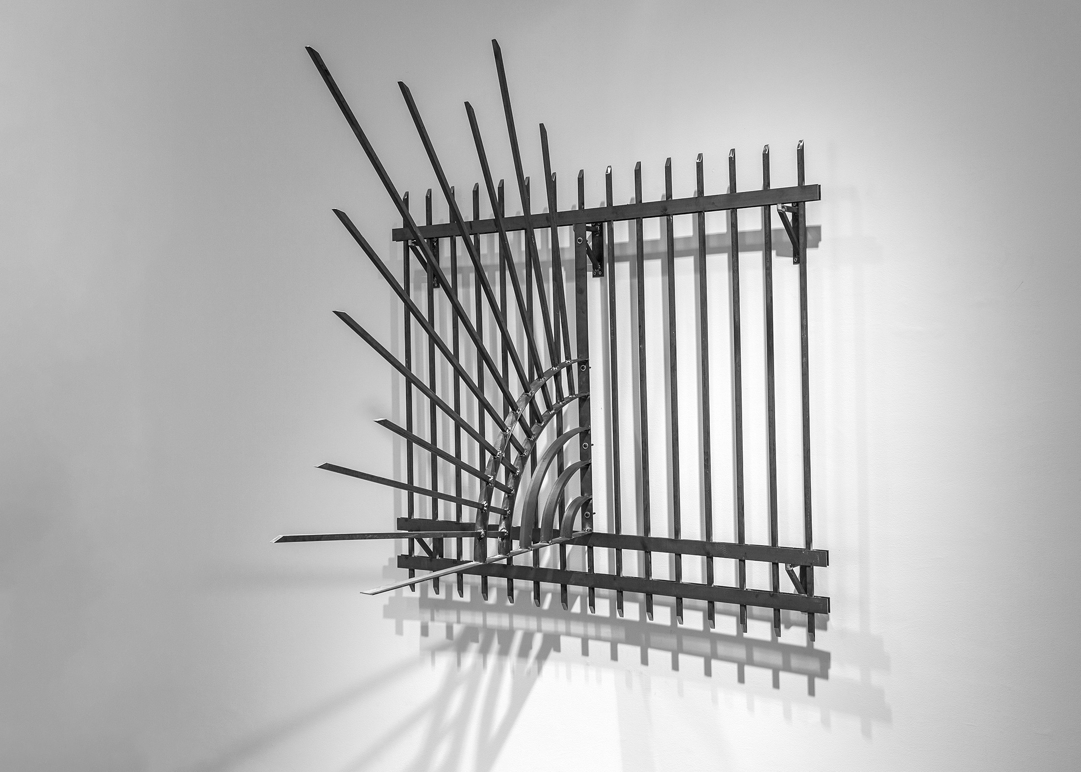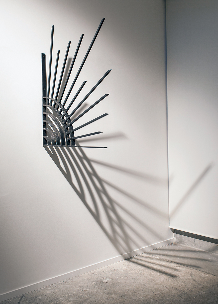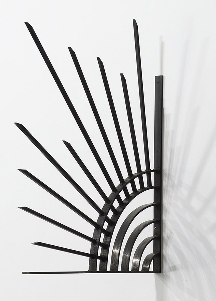 “The work entitled Defense emulates the metal structures we build around the periphery in order to protect ourselves from the intrusion of thieves, while offering an image of a black sun; a symbolic