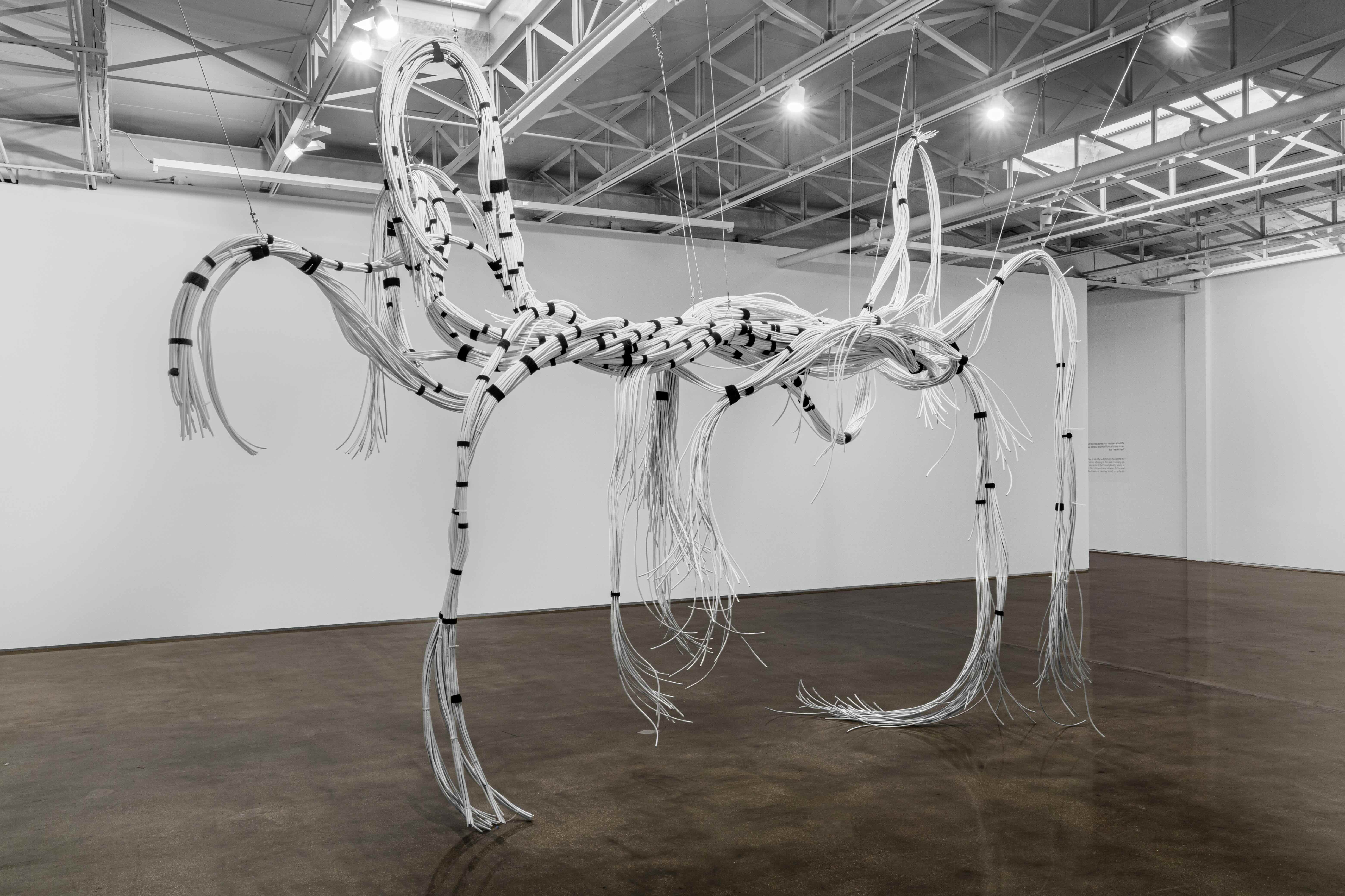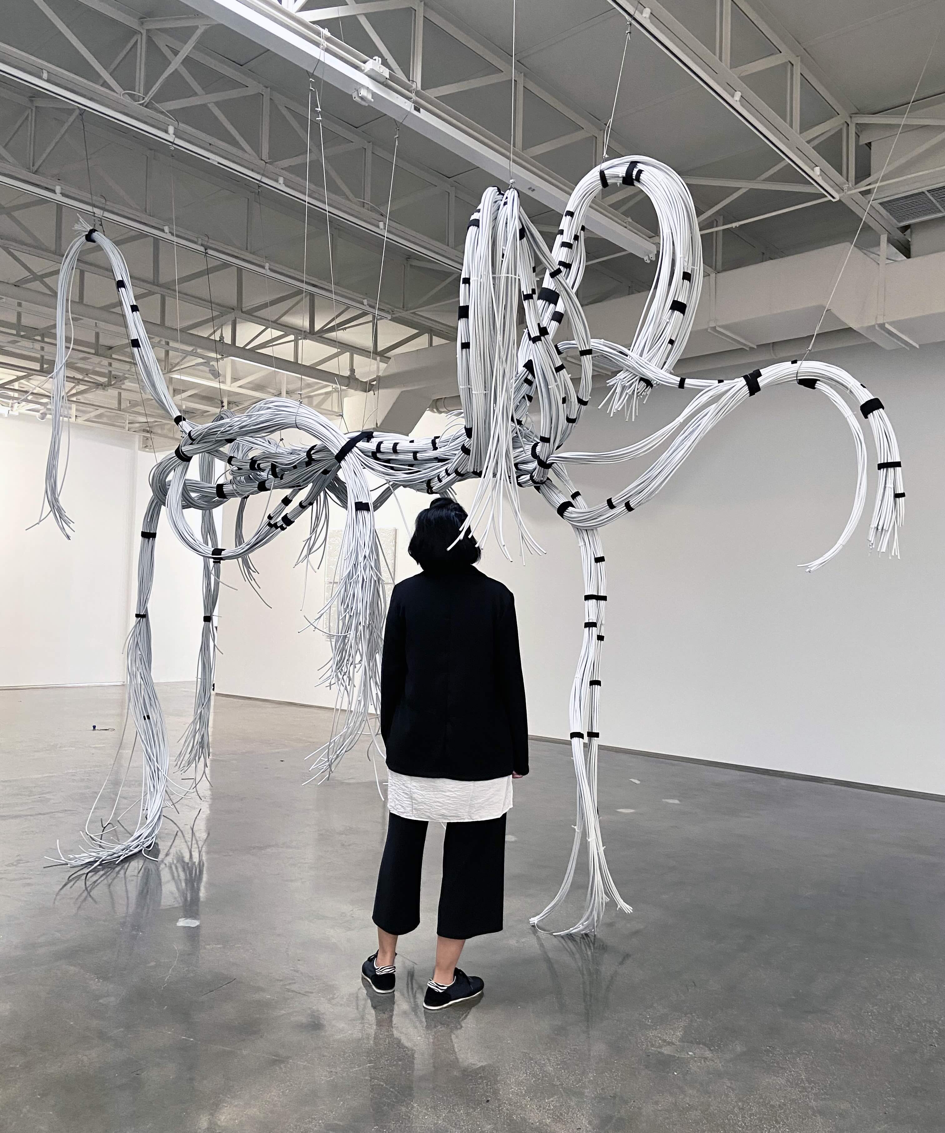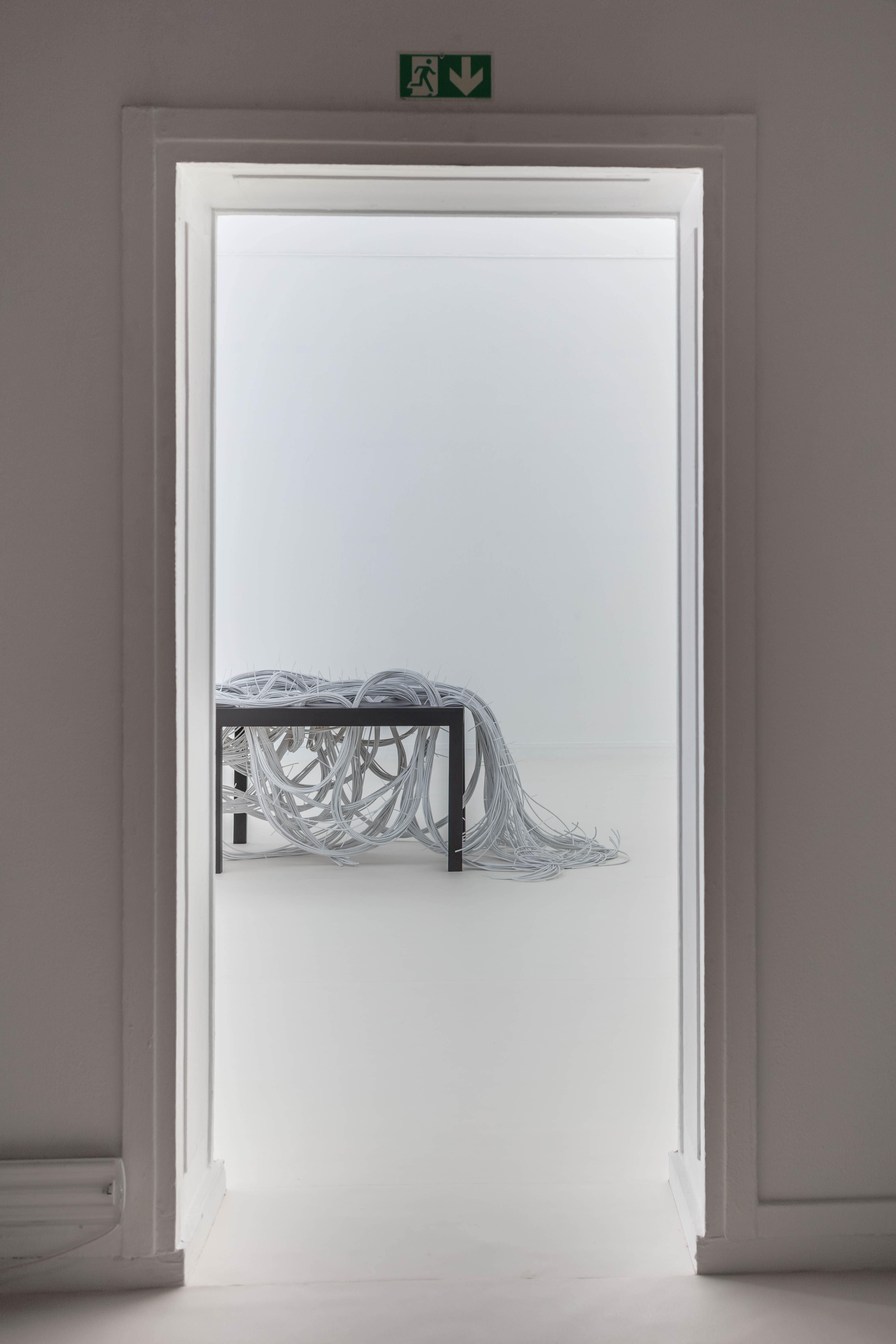 The installation “Everything Behind Me” invites viewers to a spectacle of considerable scale. Several hundred meters of thick white coaxial cable, bundled together with clamping collars appear to fall down from the ceiling. The cables descend and occupy the space in a random way, forming a complex intertwined network, like a labyrinth in the air, of which the beginning and the end are lost. Since 1998, antenna cables have been a recurring material in the artist’s work. Its presence symbolizes the circulation of information and is part of a reflection on the relations of individuals to contemporary societies, on which the power of images and the dizzying multiplication of cultural and material productions, as well as the complexity of exchanges, leave their mark.