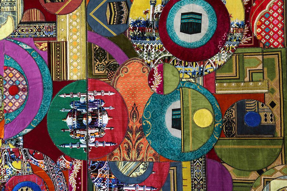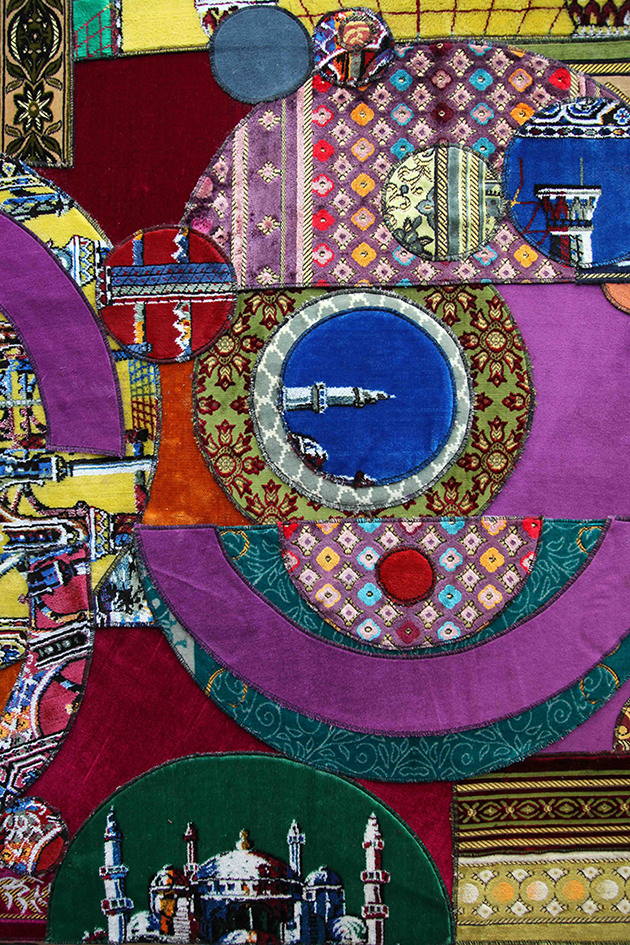 From afar the collage is abstract and consumed with color. It's non political, non-referential. In the details however, you see snippets of the carpet's original intent: an image of the Ka'aba, fragments of Islamic architecture, tips of a mosque. Another layer to this piece lies behind the scenes in the fabrication of prayer rugs.