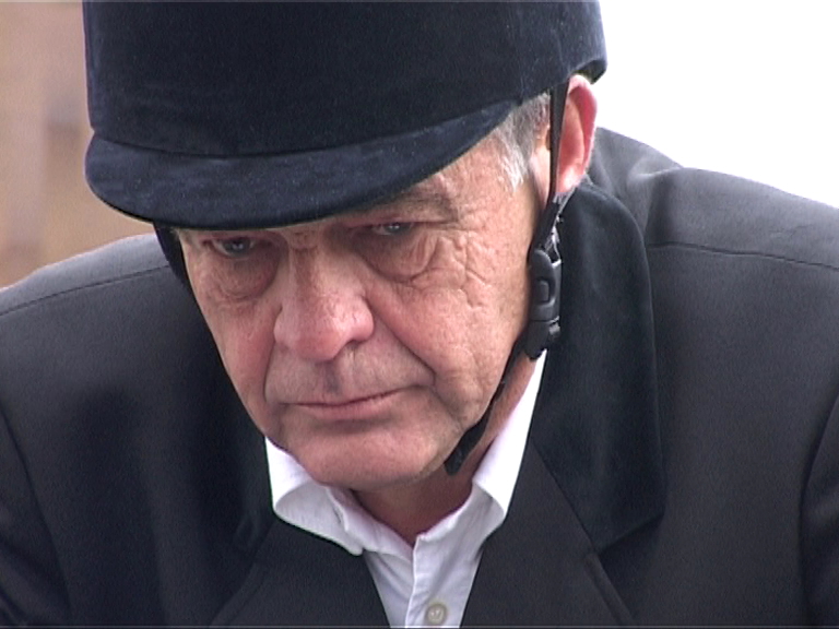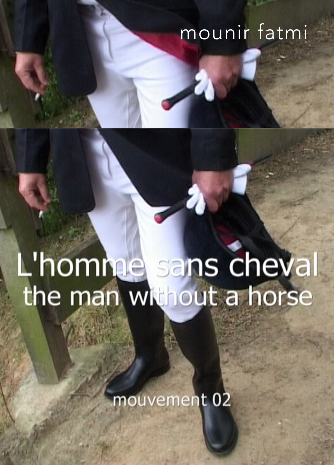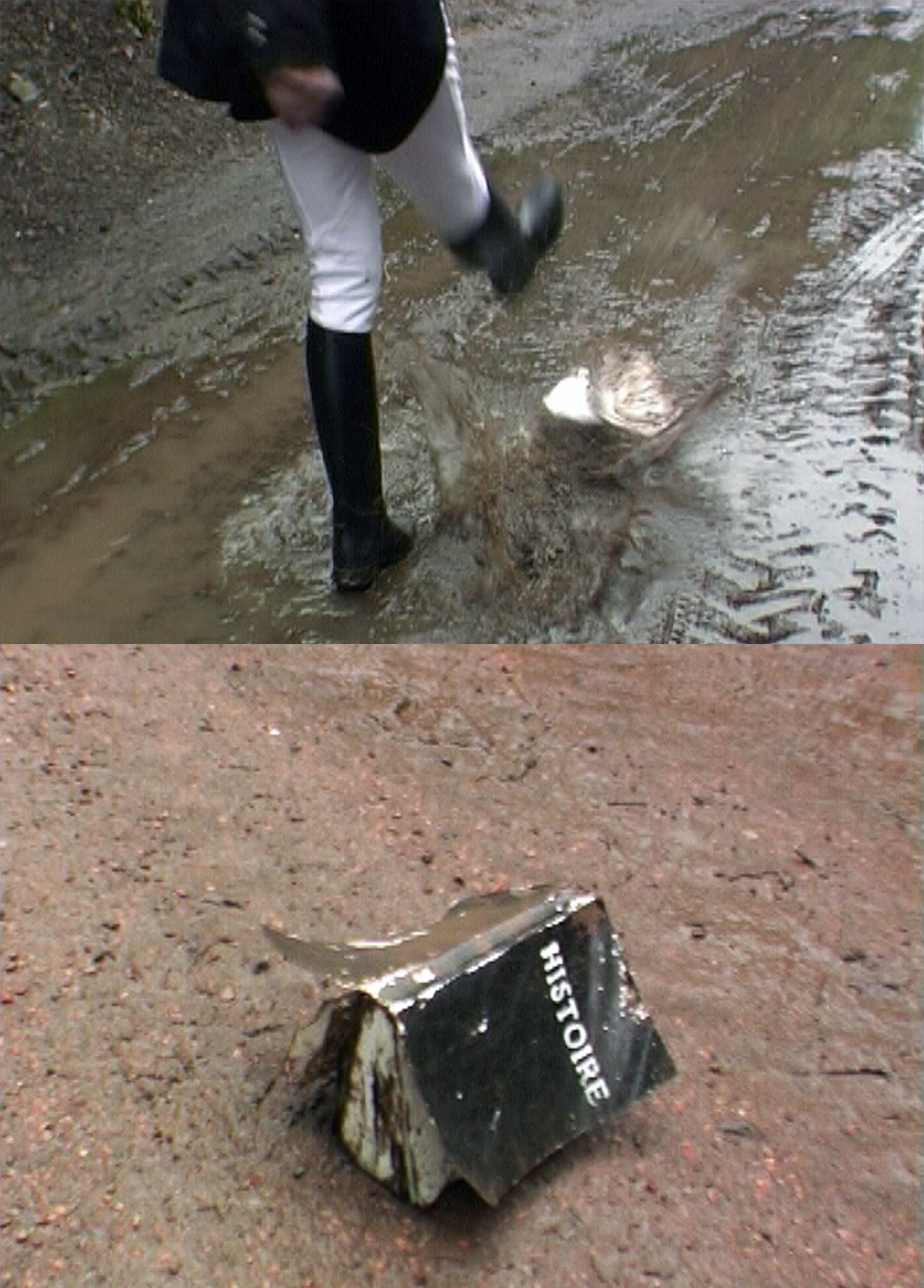 A man (the same as in movement 02) dressed in impeccable cavalier garb appears at the top of a path, in a damp and deserted semi-urban landscape. The rider "starts to kick a book, pushing it infront of him as he walks along. Violent and systematic kicks - whether he does it out of revenge or pique, we do not know"*
